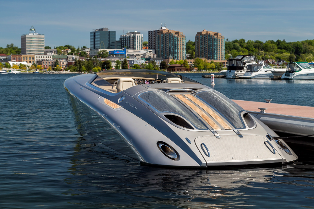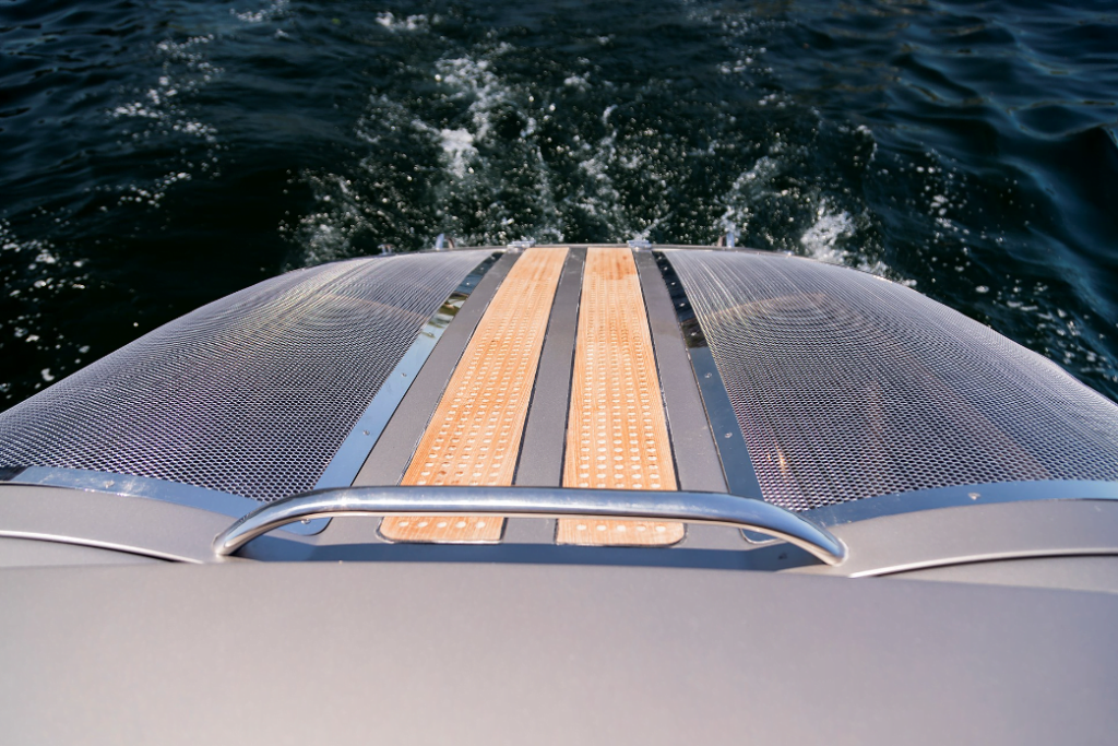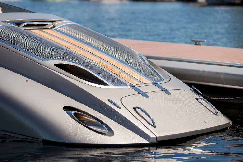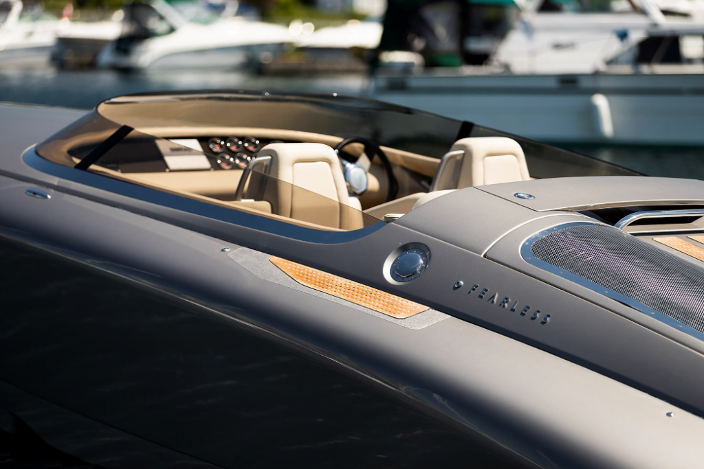 Donzi 28 Fearless är resultatet av ett unikt partnerskap mellan två ledande namn inom design och ingenjörskonst – Donzi, en pionjär inom snabba båtar, och Porsche Design, en ikon inom fordons- och produktdesign. Den innovativa designen är tydligt inspirerad av Porsche-bilar, med skarpa linjer, minimalistisk estetik och en aerodynamisk silhuett som genast fångar uppmärksamheten.
