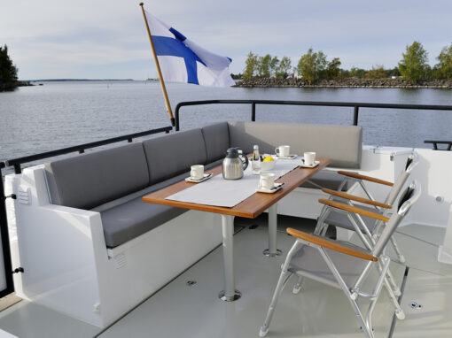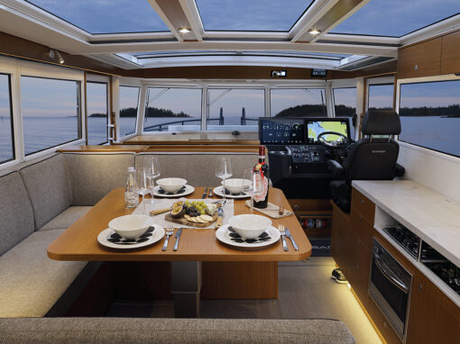 Under en provtur med Sargo 45 i den finska skärgården blev båtens enastående prestanda och komfort tydligt. Trots de kyliga, blåsiga förhållandena rörde sig båten smidigt genom vattnet, och den stabila gången gav en känsla av trygghet och kontroll. Interiörens elegans och de rymliga utrymmena gjorde det enkelt att njuta av resan, även under längre tid.