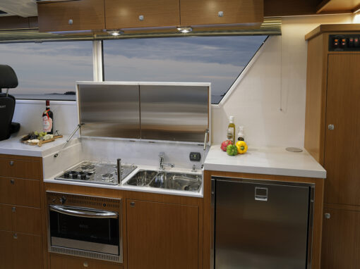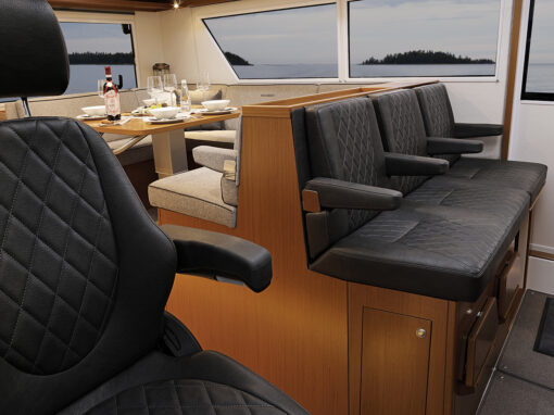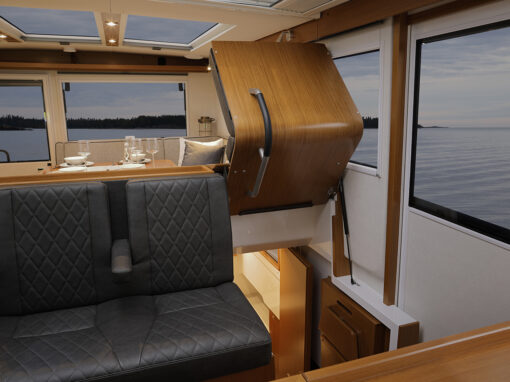 Flyttandet mellan styrplatsen på flybridgen och den inre styrplatsen var smidigt, och båda platserna erbjöd utmärkt sikt och enkel tillgång till alla nödvändiga reglage och instrument. Den höga nivån av komfort och de lyxiga detaljerna i interiören gjorde att man kände sig som hemma, oavsett om man var på en kortare tur eller en längre expedition.