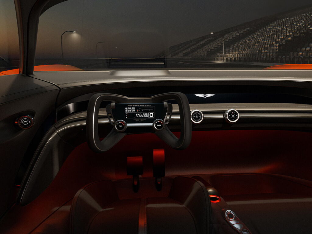 Lyx och Komfort för Högre Nivåer av Körning: Genesis X Gran Berlinetta Concepts interiör är en konstellation av premiummaterial och bekvämligheter. Från bekväma säten till genomtänkt belysning strålar varje detalj lyx och skapar en trivsam miljö inuti denna eleganta superbil.