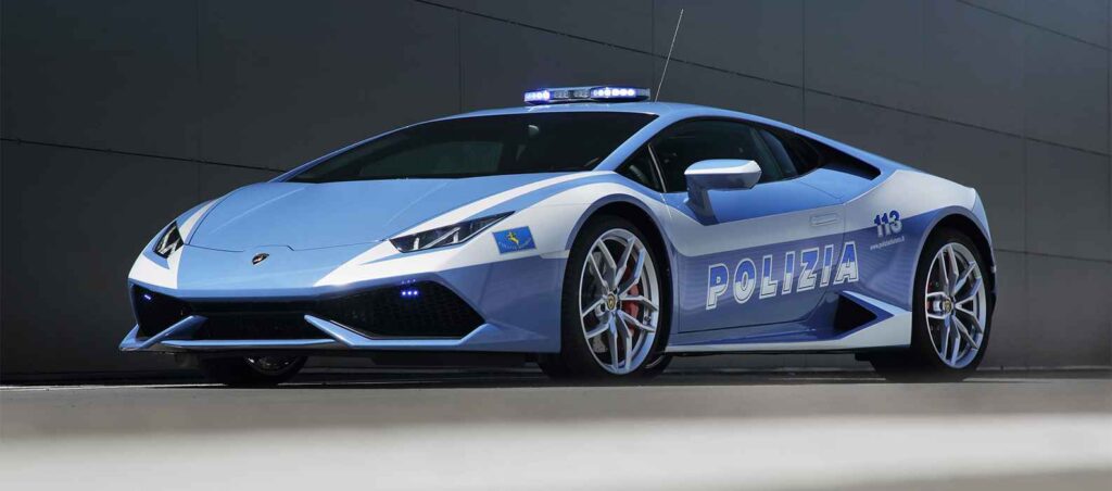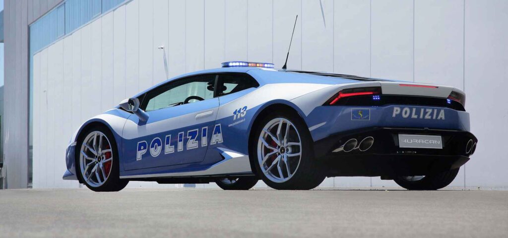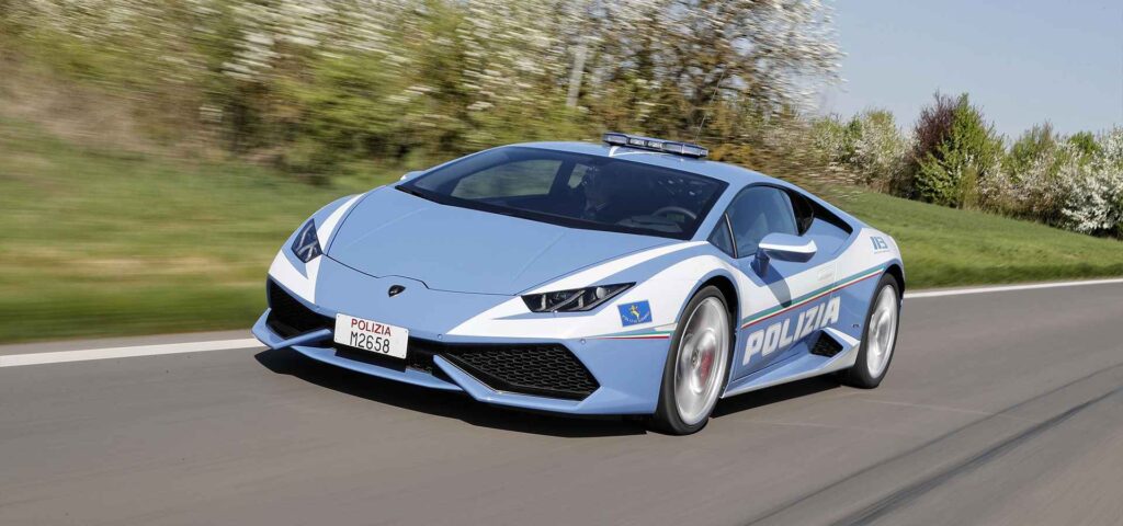 År 2014 levererade Lamborghini en Huracán LP 610-4 till polisen, med en andra modell tillkommen 2017. Denna bil, utrustad med en naturligt aspirerad 5,2-liters V10-motor på 610 hästkrafter, kombinerar exceptionell prestanda med avancerad säkerhetsteknik. Bland förbättringarna finns en aerodynamiskt optimerad takmonterad ljusramp och LED-belysning för ökad synlighet. Bilen kunde accelerera från 0 till 100 km/h på endast 3,2 sekunder och nå en topphastighet på 325 km/h.
