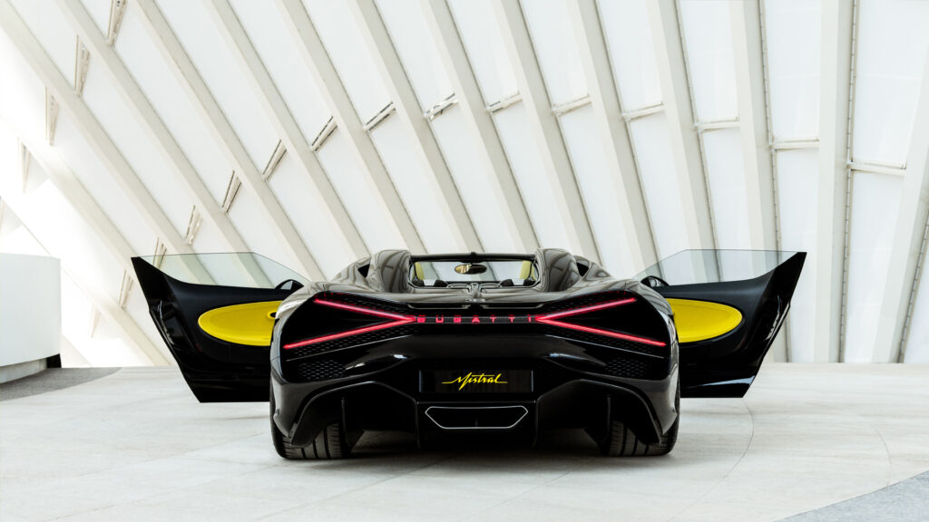 Med en toppfart på 420 km/h är W16 Mistral världens snabbaste öppna bil. Designen är en symbios av estetik och aerodynamik, inspirerad av Bugatti Type 57 Roadster Grand Raid från 1930-talet. De bakre ljuslyktorna formar ett X-mönster, en symbol för att W16-eran avslutas. Interiören är lika exklusiv som exteriören, med specialanpassade material och en mittkonsol skapad av solid, polerad aluminium.