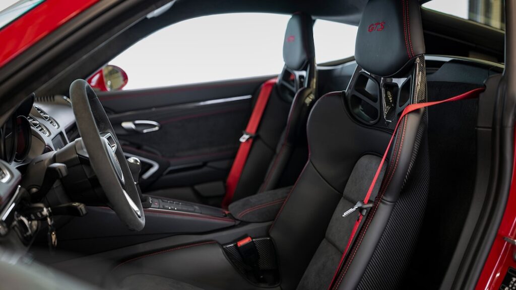 Interiören i Cayman GTS 4.0 är en blandning av lyx och sportighet. Materialen är av högsta kvalitet, med mycket Alcantara, läder och kolfiber som skapar en exklusiv atmosfär. Förarplatsen är ergonomiskt utformad för att ge bästa möjliga kontroll och komfort, med intuitivt placerade reglage och en sportig, låg sittställning.